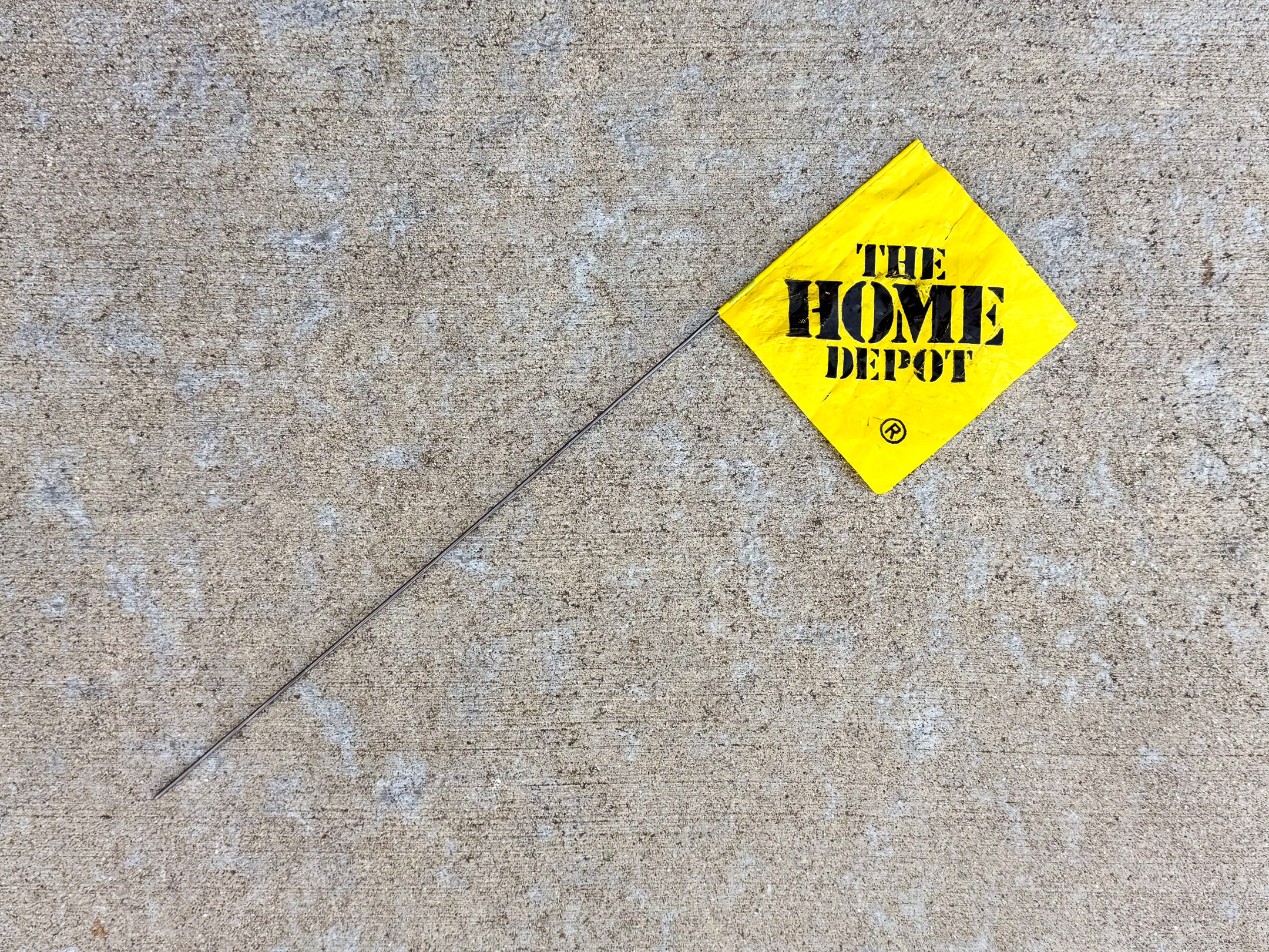 Stuff I Found Running By Uhl Mar 22, 2026 Eagle, ID Home (Depot) run. Yellow survey flag on a thin metal wire with black stencil text reading THE HOME DEPOT, lying diagonally. PrevOlderStuff I Found Running